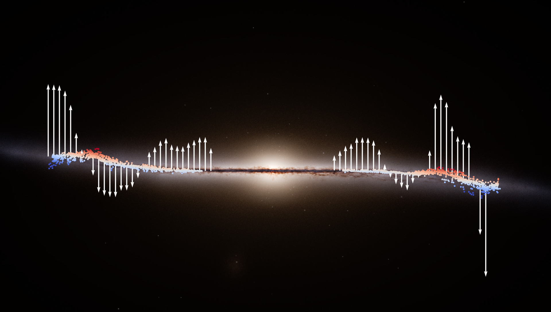 Immagine di apertura: Il disco della nostra galassia, visto di taglio. I punti rossi evidenziano le stelle che sono sopra il piano equatoriale, in blu quelle che sono al di sotto. Le frecce indicano la direzione dello scostamento, evidenziando graficamente il moto ‘ondoso’
