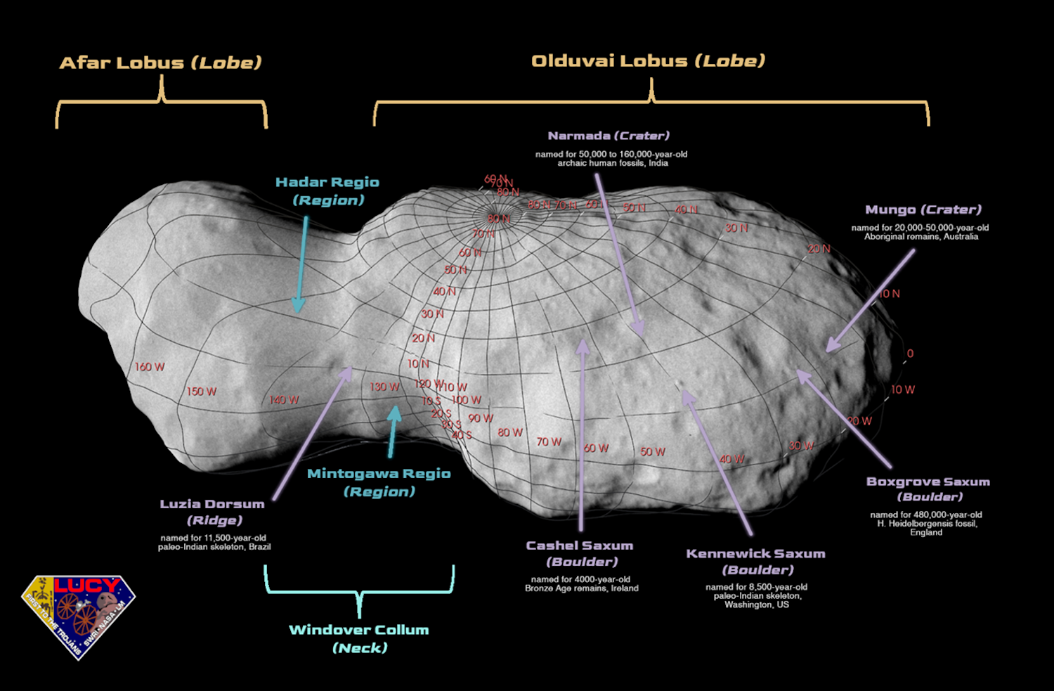 L’asteroide visitato da Lucy ha ora caratteristiche superficiali con nomi ufficiali