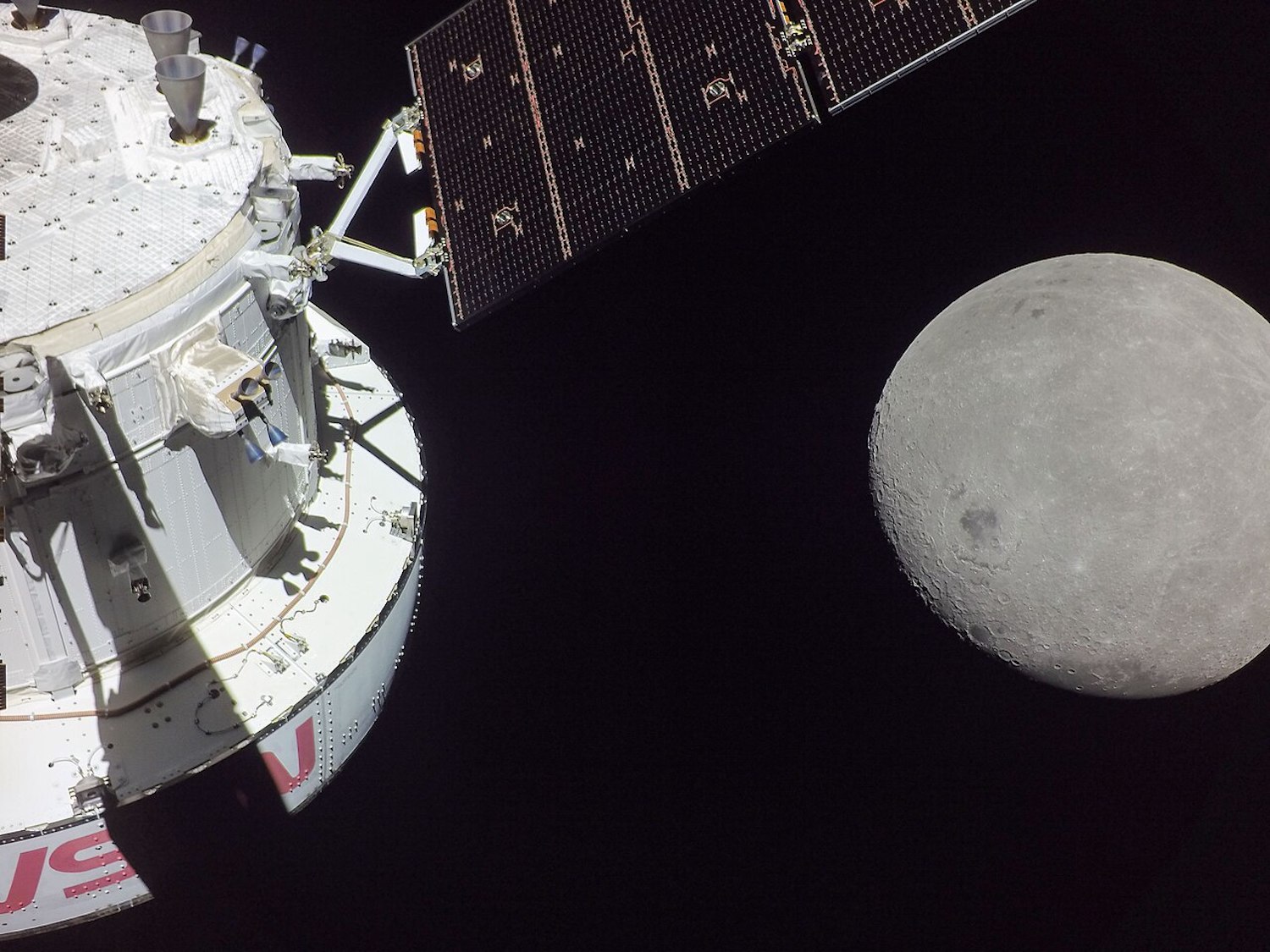 Immagine in evidenza: immagine scattata durante la missione Artemis I dalla fotocamera di navigazione ottica della navicella Orion il 21 novembre 2022, mentre la capsula e il Modulo di servizio europeo effettuano un sorvolo del satellite naturale. Crediti: Nasa