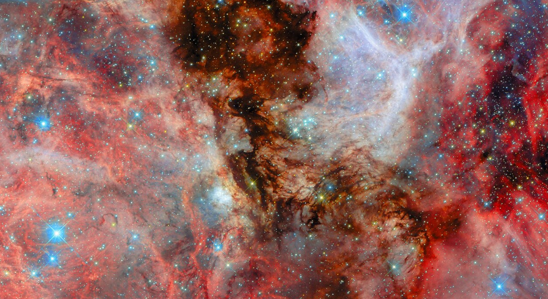 Hubble ha ripreso un campo gremito di stelle che spiccano su uno sfondo variegato di gas e polveri: le nubi di idrogeno si presentano come un complesso intreccio di creste, cavità e filamenti scintillanti e sono illuminate dall’intensa radiazione delle baby stelle. Gli astri nascenti, che hanno tinto di un rosso sfavillante l’idrogeno, sono stati gli ‘artisti’ che hanno scolpito le nubi. L’immagine, realizzata nell’ottico con cinque diversi filtri, mostra dunque il dinamismo delle interazioni nella materia da cui traggono origine i nuovi astri, evidenziando il ciclo continuo dei loro processi di formazione ed evoluzione.
