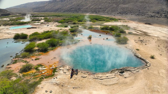 Alalobad è un’area geotermale attiva nella Depressione dell’Afar, le cui condizioni ambientali potrebbero ricordare, per certi aspetti, quelle presenti su Marte oltre tre miliardi di anni fa. Qui il paesaggio appare quasi alieno: il terreno è punteggiato di pozze ribollenti che raggiungono temperature estremamente elevate, talvolta prossime o superiori ai 90 °C, con valori di pH molto variabili, getti di vapore, piccoli geyser e fumarole, ed è disseminato di colori intensi – dal giallo all’arancio – generati dai pigmenti dei microrganismi che prosperano in queste condizioni.