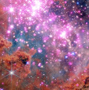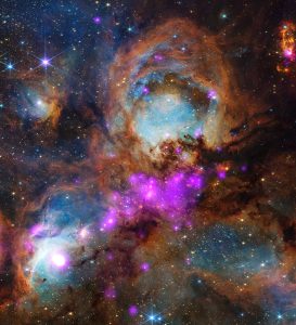 Un po’ più avanti in questa ‘stagione’ cosmica troviamo regioni come Ngc 346, la Nebulosa Fiamma e Westerlund 2, dove le stelle hanno tra uno e tre milioni di anni. Ngc 346, situata nella Piccola Nube di Magellano, appare come un cielo punteggiato di luci arancio, bianche e blu. Lunghe striature nebulose attraversano la scena, mentre una grande nube rosa brillante – traccia dei raggi X – domina la parte superiore.