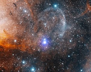 Westerlund 2 mostra un giovane ammasso stellare: decine di stelle bianche, circondate da aloni rosa neon, si dispongono lungo una fascia diagonale che attraversa l’immagine. Intorno, nubi di polvere color arancio intenso ‘riscaldano’ la scena.