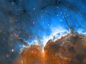 Nella Nebulosa Pellicano, i dati a raggi X di Chandra si mescolano con le immagini ottiche del telescopio Hubble, creando un paesaggio luminoso e ricco di dettagli: un ampio cielo azzurro velato, punteggiato da luci rosa, bianche e dorate, attraversato da una densa nube arancione che entra nella scena dal basso a destra, da cui si allungano filamenti sottili.