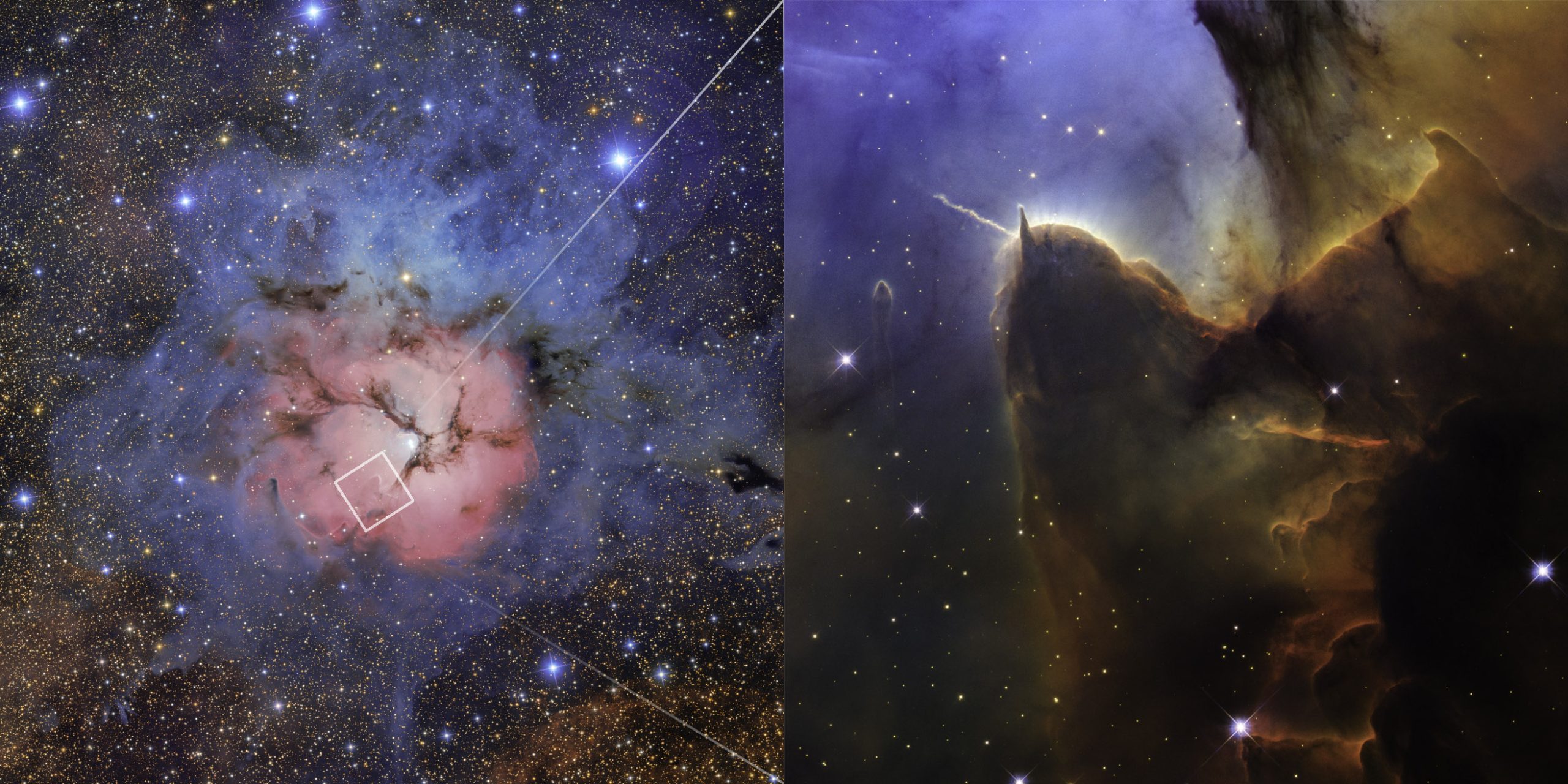 L’immagine di Hubble della Nebulosa Trifida si concentra sulla Herbig-Haro 399, un getto di plasma espulso da una giovane protostella. Osservare l’espansione del getto dal 1997 a oggi permette ai ricercatori di misurare la velocità dei flussi e determinare quanta energia la protostella sta iniettando in queste regioni, oltre a comprendere come le nuove stelle interagiscono con l’ambiente circostante. Il colore blu più nitido in alto a sinistra è spiegato dai venti stellari provenienti da stelle massicce, non presenti nel campo visivo, che hanno spazzato via la polvere circostante. Il flusso di gas, visibile in giallo, è un esempio di luce ultravioletta che penetra nella polvere marrone scuro, disgregando e smantellando il gas e la polvere.